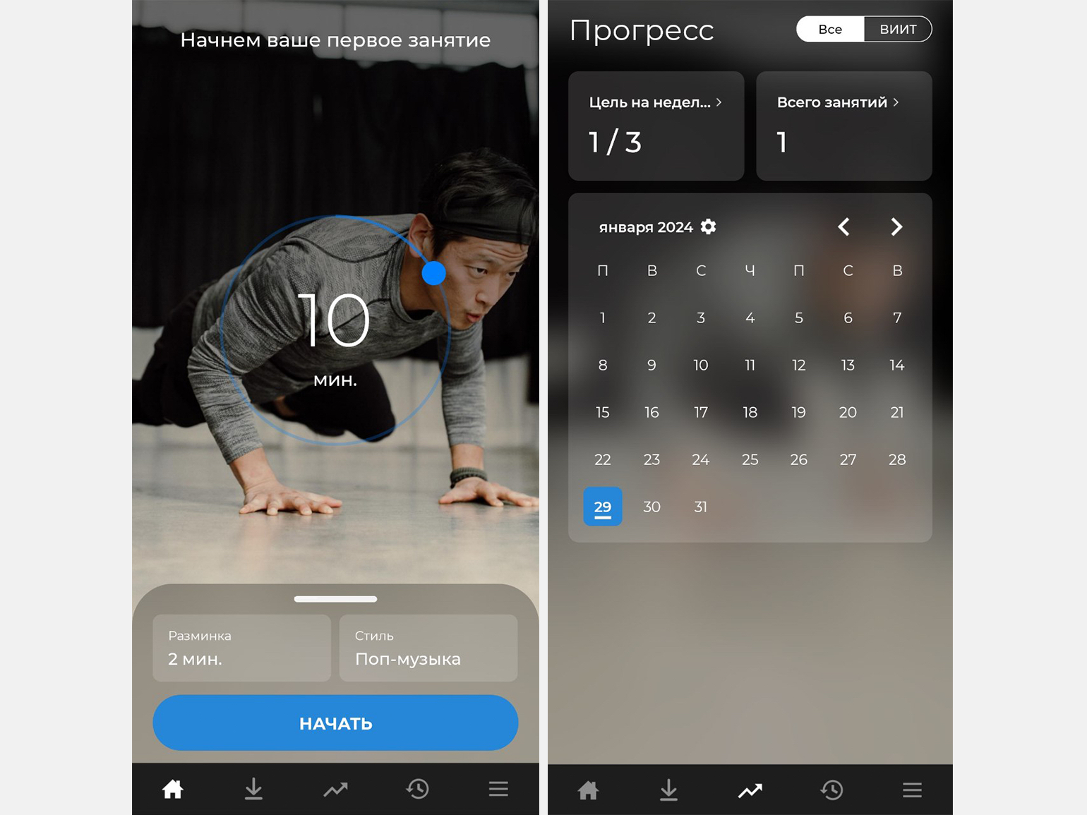 - Тренировки по времени и по количеству повторений